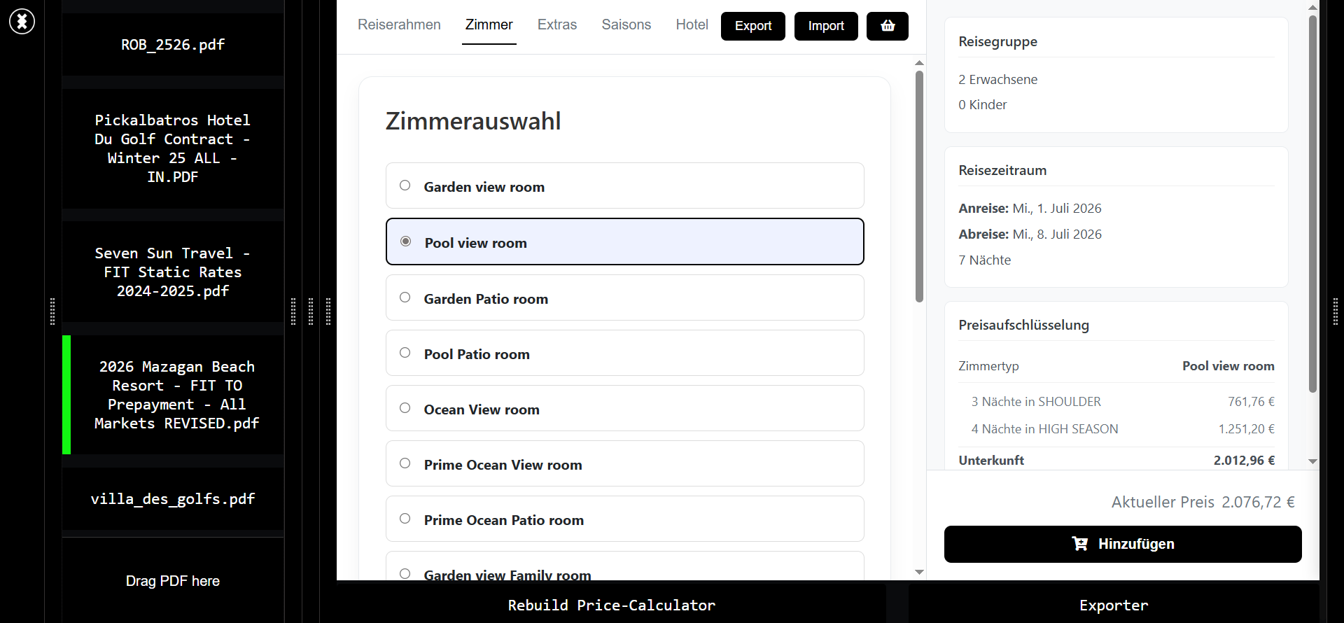 - Automatisches Auslesen aller Vertragsdetails, wie z.B. Saisons, Zimmerkategorien und Saisonpreise. Erkennung von Extras, wie Silvestermenüs oder Kurtaxen.